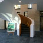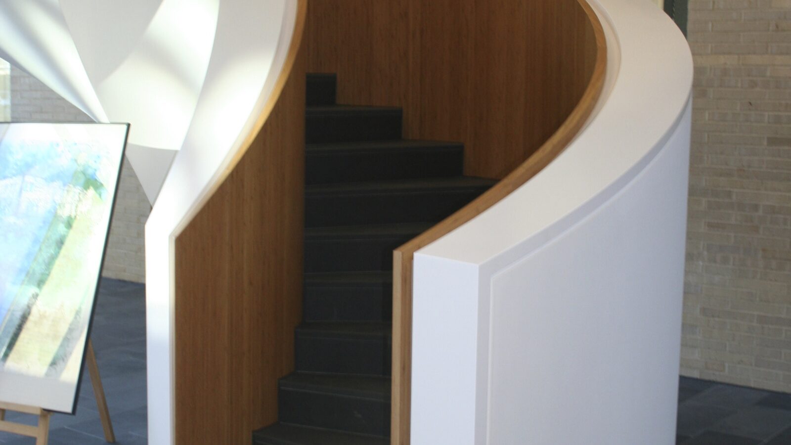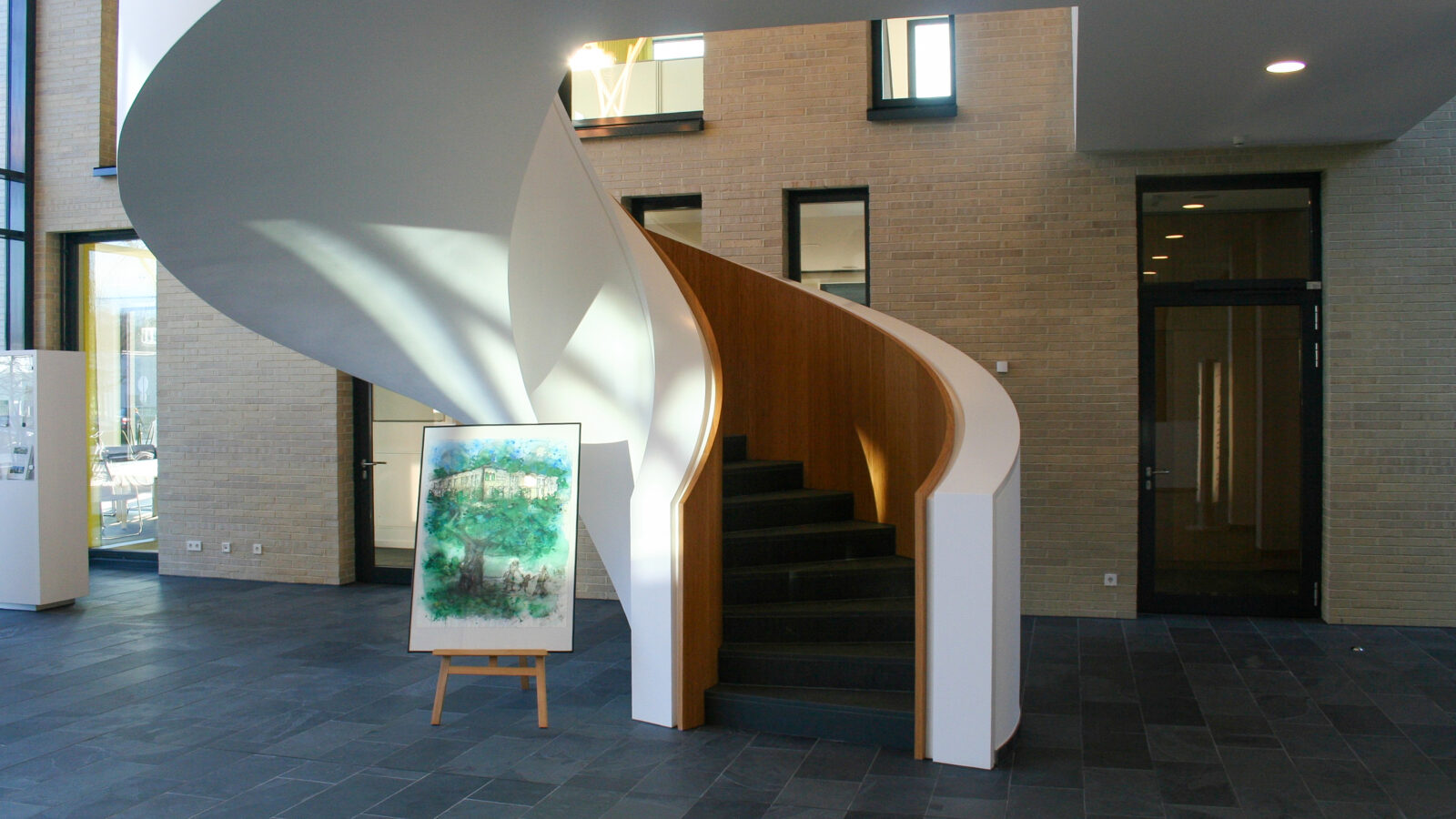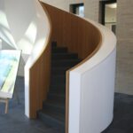 Ein besonderes Highlight des Projekts ist das gebogene Treppengeländer inklusive Holzverkleidung, das mit hoher handwerklicher Präzision gefertigt und montiert wurde. Produktion und Montage erfolgten vollständig aus einer Hand, wodurch eine gleichbleibend hohe Qualität und eine reibungslose Umsetzung gewährleistet werden konnten. Das Ergebnis ist eine moderne, funktionale und zugleich repräsentative Innenarchitektur, die den Anspruch des Neubaus konsequent widerspiegelt.