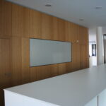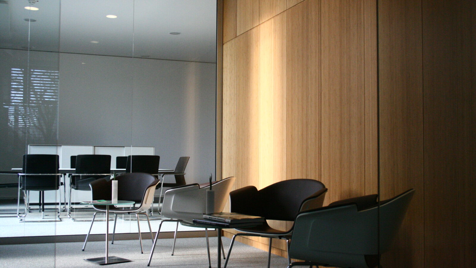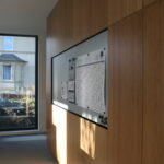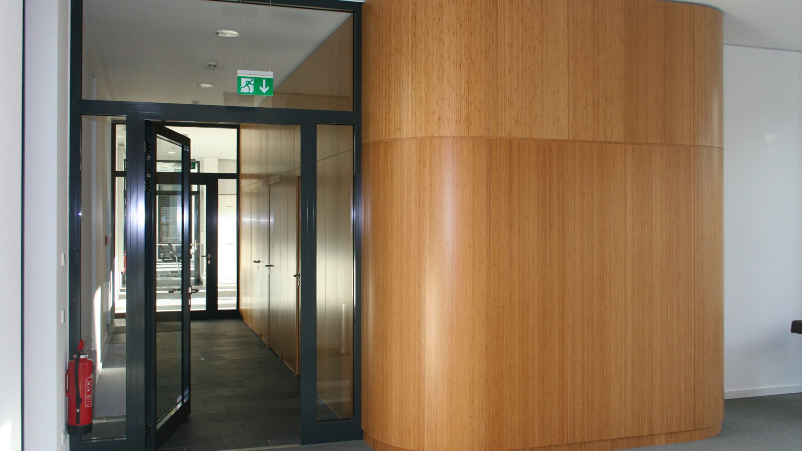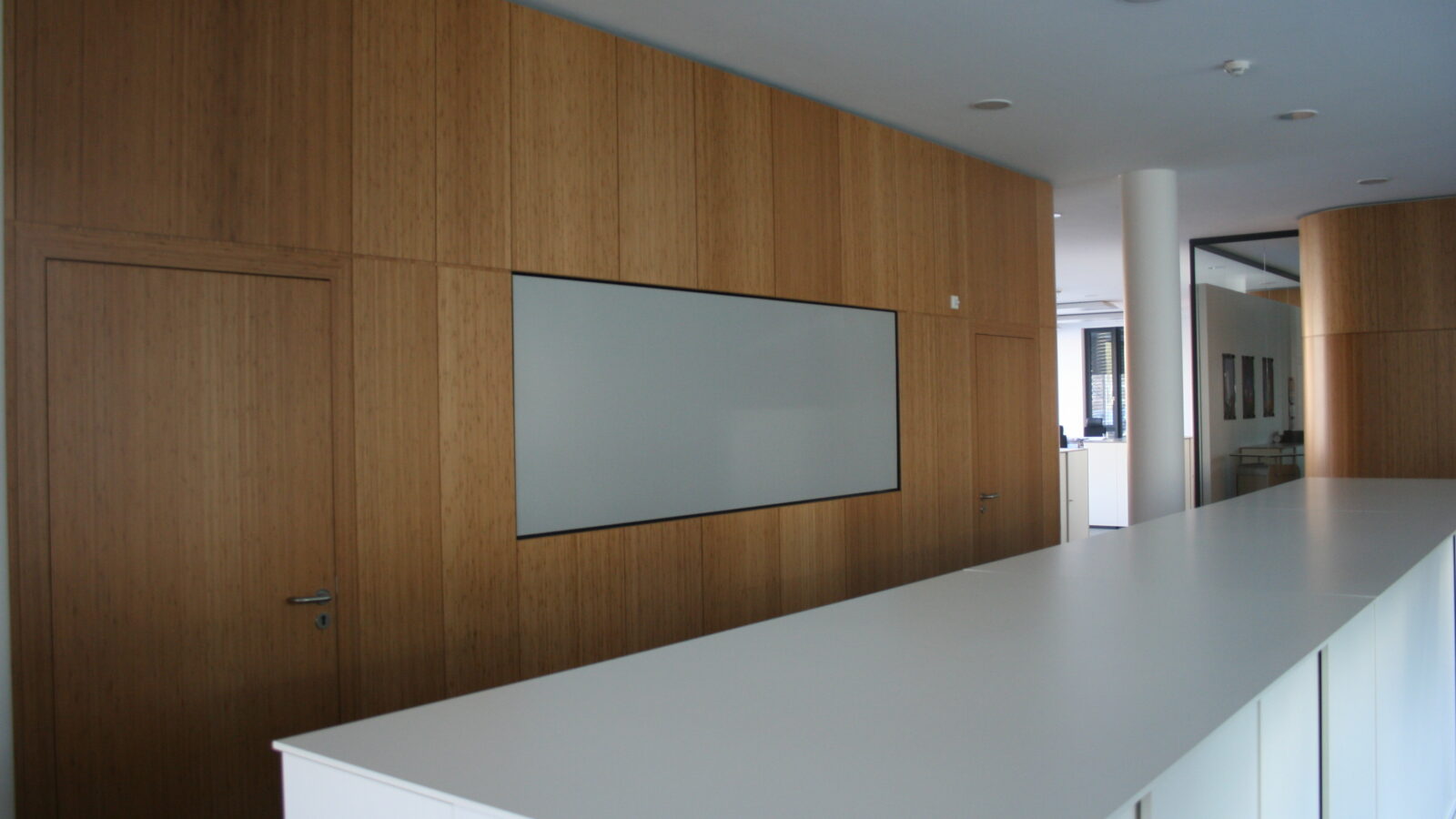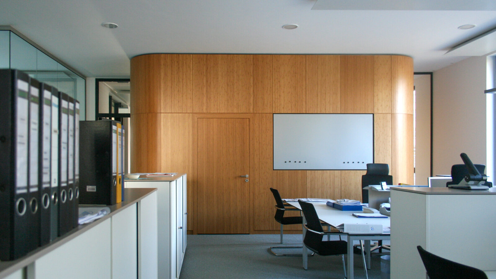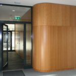 Im Mittelpunkt stand die Verarbeitung von Echtholz in Kombination mit gebogenen Wandflächen und integrierten Akustikelementen. Flächenbündig eingearbeitete Türen fügen sich nahtlos in die Wandgestaltung ein und unterstreichen die klare architektonische Linie. Die anspruchsvolle Geometrie der Bauteile stellte hohe Anforderungen an Planung, Fertigung und Ausführung.