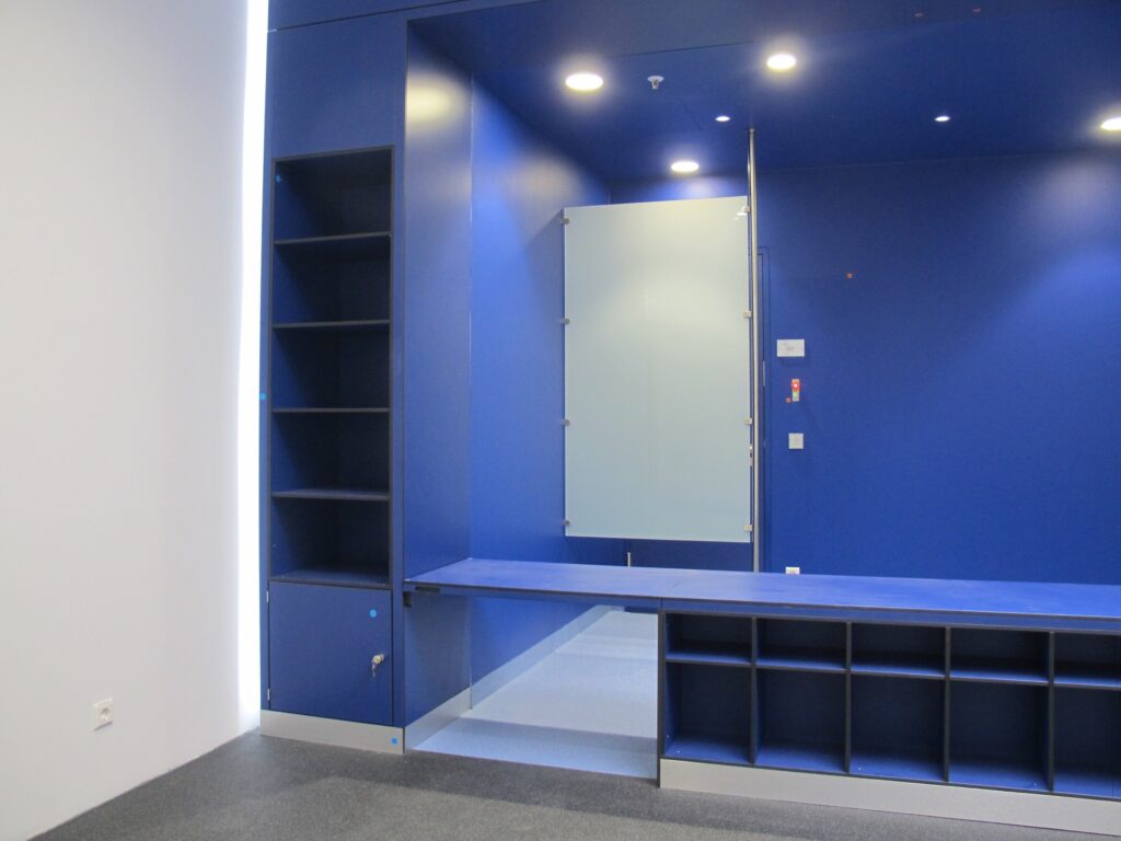 Die Personalschleuse ist die kritische Schnittstelle. Wir fertigen Möblierungskonzepte zur strikten Trennung in Schwarz/Grau/Weiß-Bereiche.