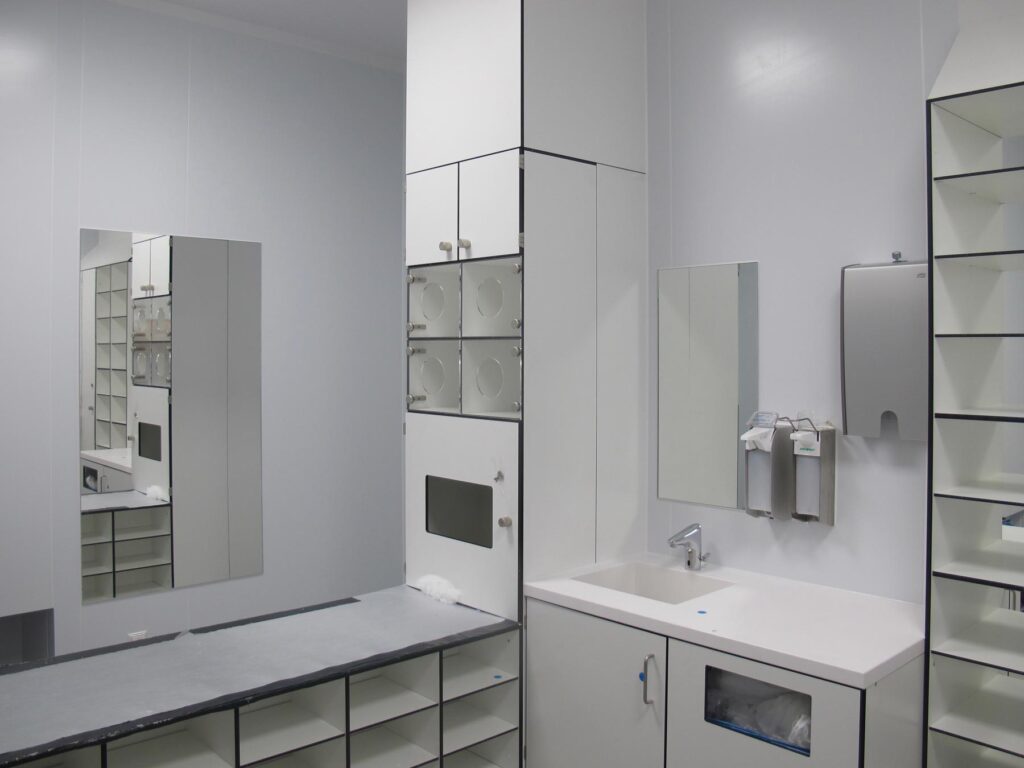 - Garderoben: Getrennte Schränke für Straßen- und Reinraumkleidung (Kittel, Overalls).