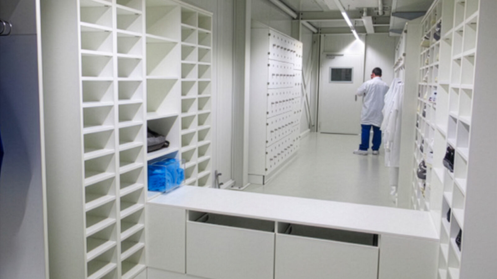 - Garderoben: Getrennte Schränke für Straßen- und Reinraumkleidung (Kittel, Overalls).